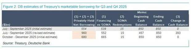 According to the Treasury, during the current quarter, Treasury now expects to borrow $1.007 trillion in net marketable debt, assuming an end-of-September cash balance of $850 billion. The borrowing estimate is $453 billion higher than announced in April 2025, primarily due to the lower beginning-of-quarter cash balance and projected lower net cash flows.