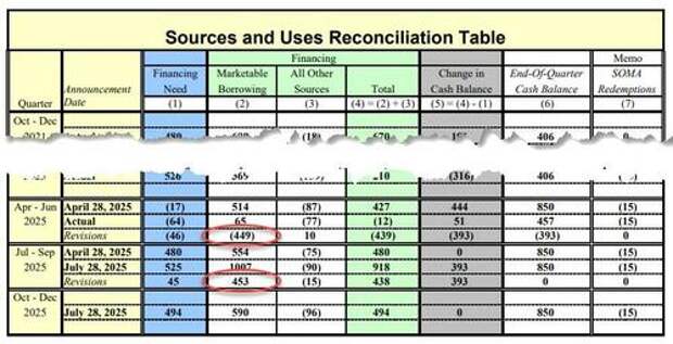 It was short by almost $50 billion. We found that out moments ago when the Treasury published its estimate for marketable borrowing needs for the July-September 2025 and October-December 2025 quarters.