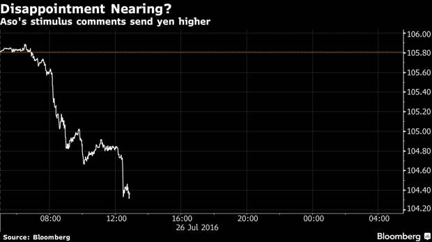 Bernard Aw, a strategist at IG Asia Pte, reiterated the concern: “Expectations of additional monetary and fiscal stimulus might have been tempered, especially when much was riding on Abe’s stimulus plan. We could also see the Fed trying to strike a balance between sounding upbeat about U.S. economic outlook and curbing exuberance about rate-hike hopes in September.”