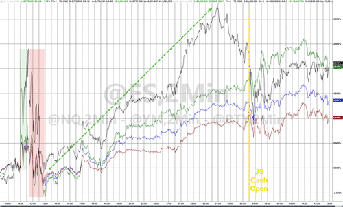 Nasdaq and Small Caps led the surge in stocks (the chart below is from 1400ET yesterday - to include the pump and dump around The Fed and Powell). The Dow is the laggard for now (up only 1%)...