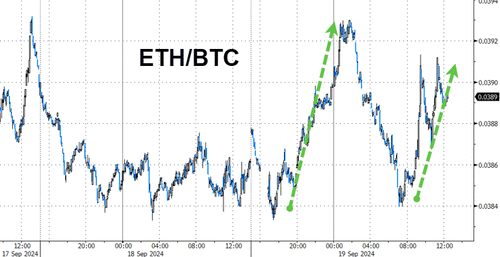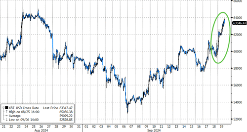 Bitcoin ripped higher today, testing up towards one-month highs at $64,000, right at the 200DMA (after breaking above the 50- and 100-DMA)...