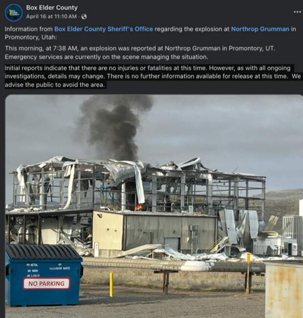 Local media Fox 13 reported that one of the aerospace and defense technology company's buildings at the Promontory test facility was destroyed in an explosion last Wednesday morning.