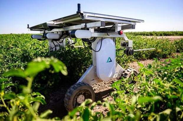 A solar-powered Aigen Element autonomous AI robot demonstrates how it hammers down on targets at Bowles Farm in Los Banos, Calif., on June 26, 2025. The robot eliminates herbicide-resistant weeds with precise ground strikes, reducing chemical use and saving labor. Josh Edelson/AFP via Getty Images