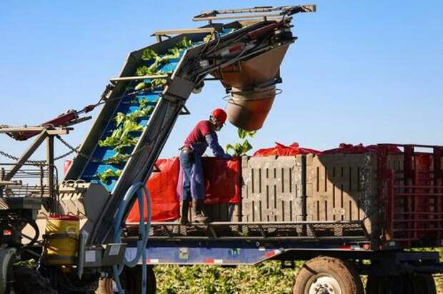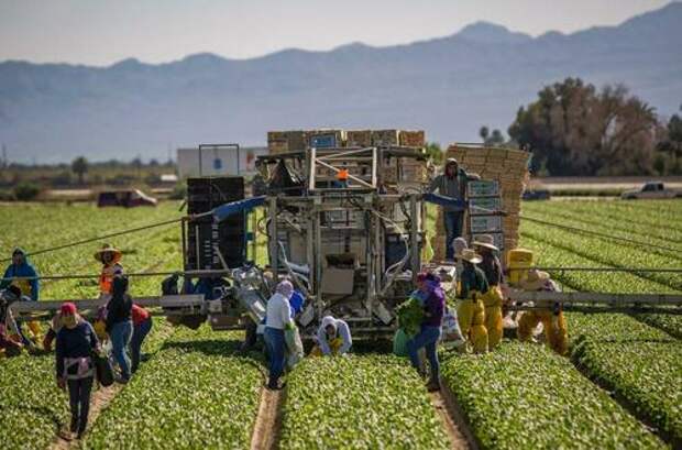 Migrant farmworkers harvest lettuce in Brawley, Calif., on Dec. 10, 2024. U.S. agriculture has long relied on migrant labor, but advances in robotics and AI could significantly reduce the farm workforce. Sandy Huffaker/AFP via Getty Images