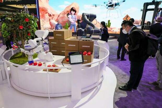 An attendee watches the smart farming Doosan Robotics M1013 (L) robot demonstrate its capabilities at CES 2022 at the Las Vegas Convention Center on Jan. 6, 2022. The M1013 can measure the sweetness of fruit and harvest them without bruising. It can also be used for seeding, watering, planting, and pesticide spraying. Ethan Miller/Getty Images