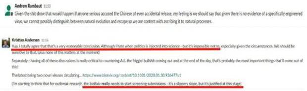 “[G]iven the shit show that would happen if anyone serious accused the Chinese of even accidental release, my feeling is we should say that given there is no evidence of a specifically engineered virus, we cannot possibly distinguish between natural evolution and escape so we are content with ascribing it to [a] natural process,” Andersen’s colleague, Dr. Andrew Rambaut, wrote to a group of virologists over Slack in February 2020.