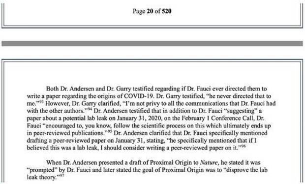 On the following page of the report, investigators note that Andersen testified that Fauci had suggested that he write a peer-reviewed paper (this is the Nature Medicine, Proximal Origins paper) on the possibility of a lab accident at Wuhan. Page 21 also reveals that Andersen emailed to Nature that Fauci and others “prompted” the paper:
