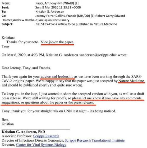 And here’s the email Andersen wrote to Nature Medicine, where he explained that the Nature Medicine Proximal Origins paper was “prompted by Jeremy Farrar, Tony Fauci, and Francis Collins.”