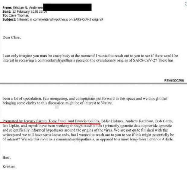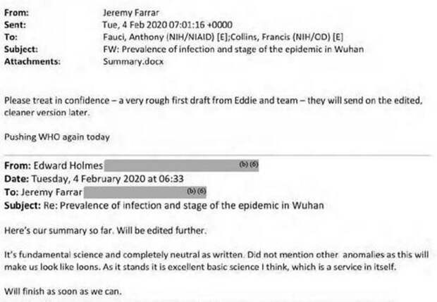 “Please treat in confidence—a very rough first draft from Eddie and team—they will send on the edited, cleaner version later,” Farrar emailed Fauci and Collins. The following day, Farrar emailed Fauci and Collins, “Tony and Francis, The revised draft from Eddie, copied here.”