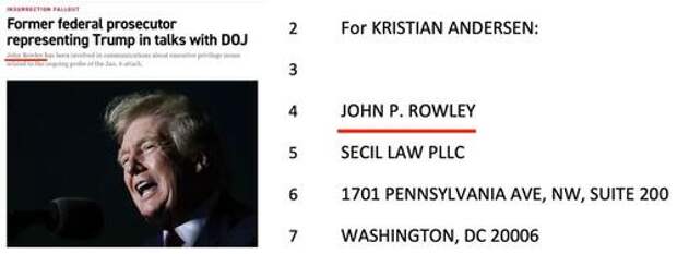 To mediate the Select Subcommittee’s demand for answers and to protect him during a deposition and public hearing, Andersen hired criminal defense lawyer, John P. Rowley, a former federal prosecutor who defended Trump before the Department of Justice.