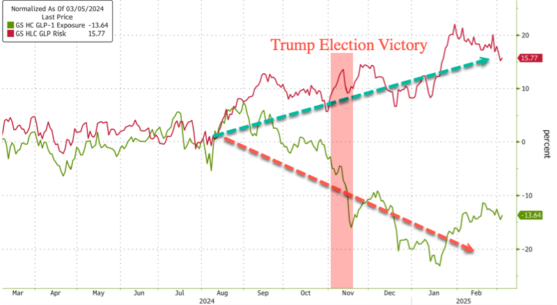 More broadly, Goldman's GLP-1 Exposed basket has largely underperformed the GLP-1 At-Risk basket over the last year. This is mainly because the market sees President Trump and RFK Jr.