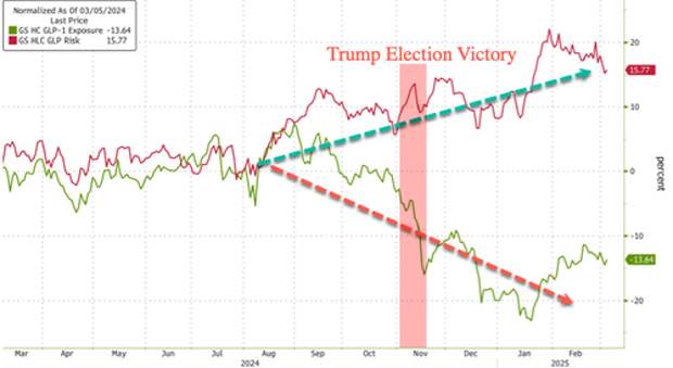 More broadly, Goldman's GLP-1 Exposed basket has largely underperformed the GLP-1 At-Risk basket over the last year. This is mainly because the market sees President Trump and RFK Jr.