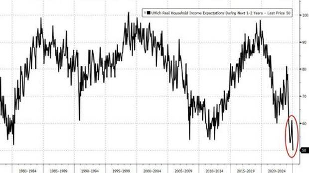 The chart below shows that the University of Michigan survey of real household income expectations is plummeting.
