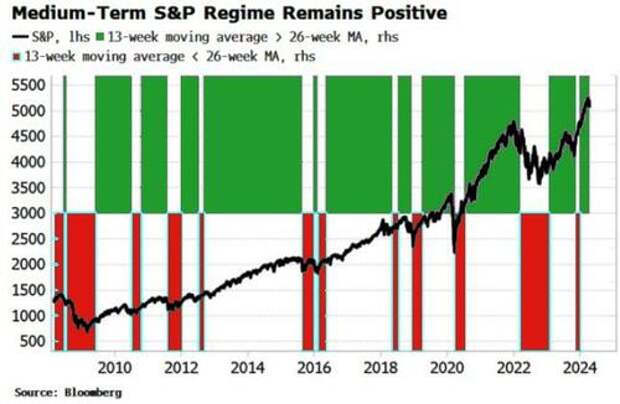 Nonetheless, the medium-term upwards trend in the market remains intact. One of the simplest and most reliable timers to tell you when to be in and out of the market is the 13 and 26-week moving average crossover for the S&P.