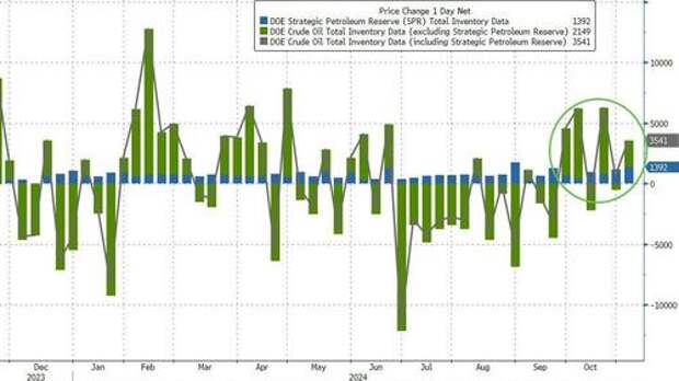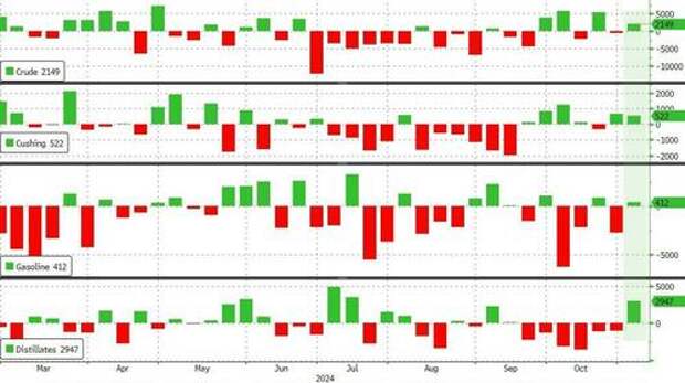 A Green sweep of inventory builds across crude and all products last week with Distillates stocks soaring by the most since July