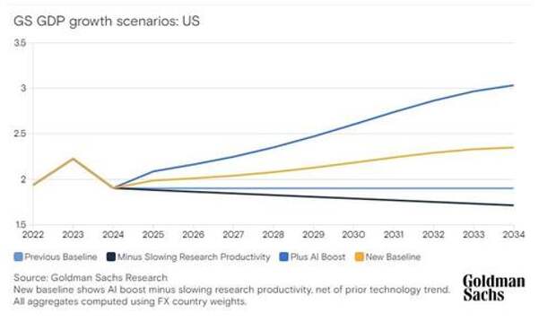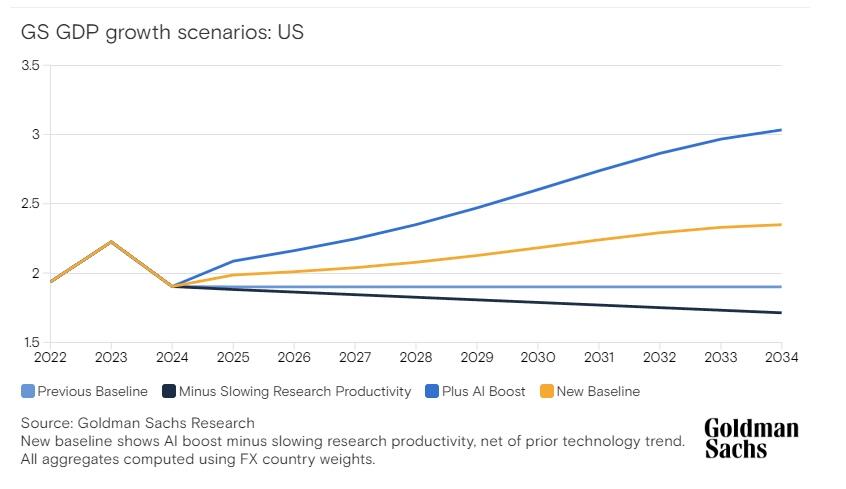 “Generative artificial intelligence has the potential to automate many work tasks and eventually boost global economic growth. AI will start having a measurable impact on US GDP in 2027 and begin affecting growth in other economies worldwide in the following years. The foundation of the forecast is the finding that AI could ultimately automate around 25% of labor tasks in advanced economies and 10-20% of work in emerging economies.”