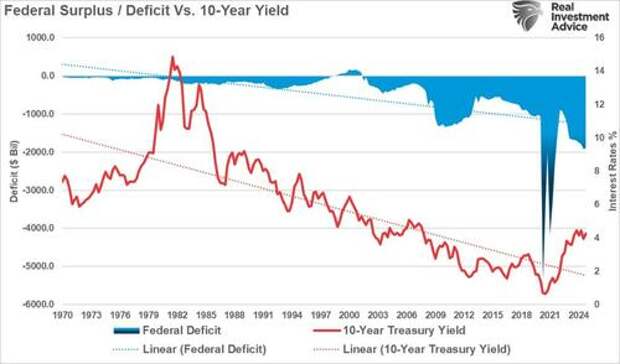 Similarly, the CBO assumes a gradually rising interest rate environment, where borrowing costs increase alongside debt issuance. However, history shows that interest rates can remain low, even as debt increases. As shown, rates decline with larger deficits as unproductive spending slows economic growth. The recent rate surge resulted from inflation from sending checks to households while shuttering the economy. As the remnants of that infusion fade, economic growth and rates will decline. However, Dalio and the CBO forget the cause of the rate surge and assume the rise was organic when it was not. As growth slows further, Central Bank interventions will challenge the CBO’s recurring narrative that rising debt will inevitably lead to a fiscal crisis via soaring interest payments.