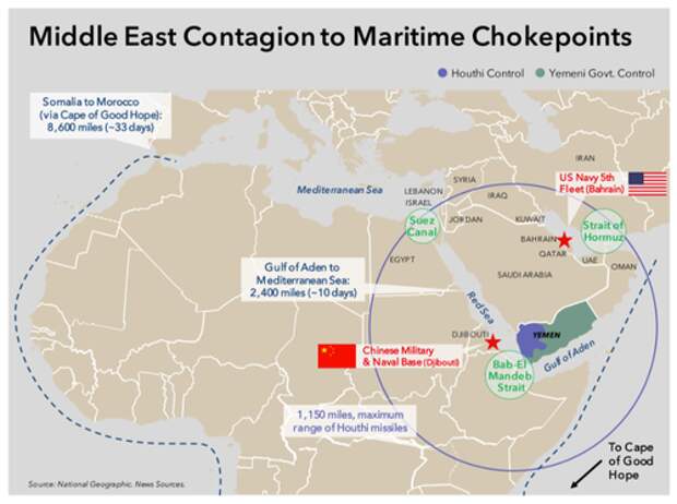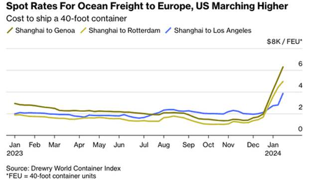 Bloomberg reported early Wednesday that one of the world's largest shippers, Maersk, told clients in a notice to prepare for supply line disruptions as containerized vessels are rerouted to the Cape of Good Hope, which takes an extra 1-2 weeks for Asia to Europe shipping lanes.