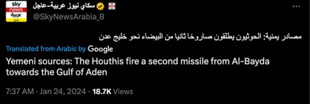 And as of writing this note, Sky News reports Houthi forces "fire a second missile from Al-Bayda towards the Gulf of Aden."
