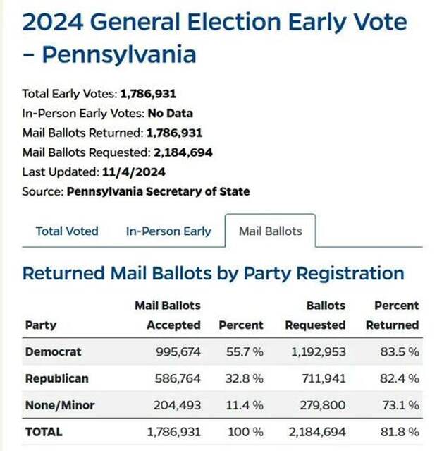 By comparison, in 2020, Democrats had a slight lead of nearly 10,000 votes. As of November 1, 2024, there have been approximately 200,000 fewer Democrats voting by mail.