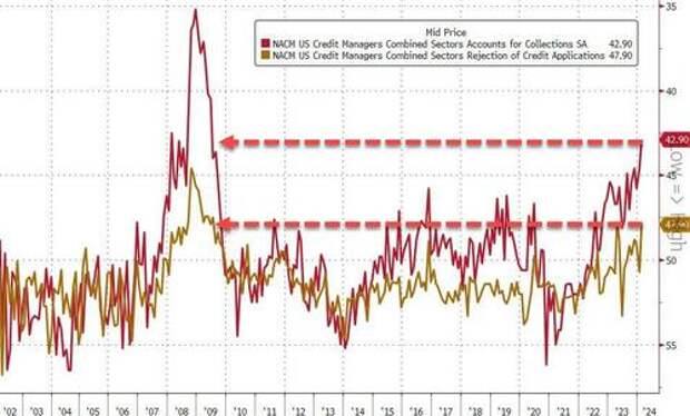 Finally, about that 'strong consumer' - The Credit Managers' survey shows that the rate of rejections for credit applications and the number of accounts moved to 'collections' is surging back to near GFC levels...