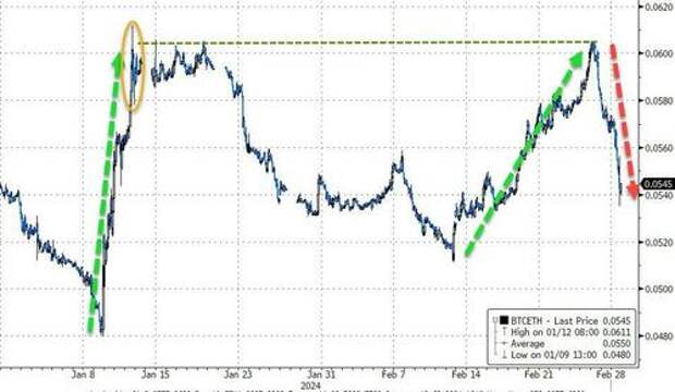 ETH has notably lagged BTC in recent days after surging up (relatively speaking) to its highest since the launch of the BTC ETFS...