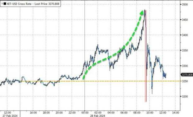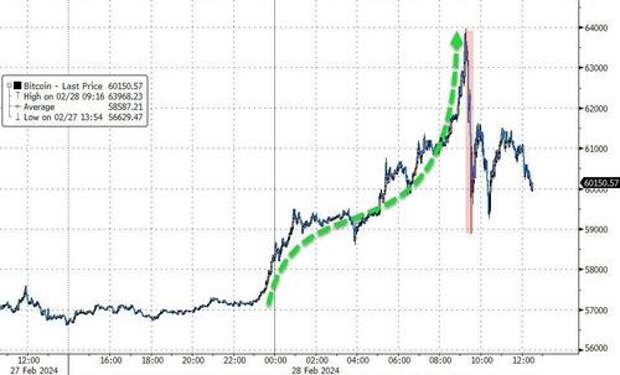 Bitcoin rallied a stunning 13% to with a few bucks of $64,000 before a wave of selling pressure appeared (seemingly from perp futures) and triggered Coinbase chaos, wiping out $5,000 of the gains before bouncing back up again.