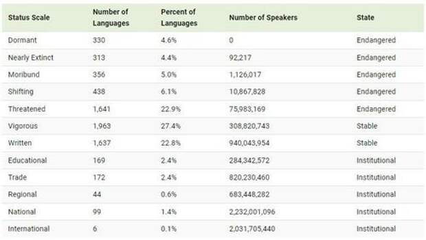According to data from Ethnologue, languages are classified across 12 states of vitality and three broader categories: