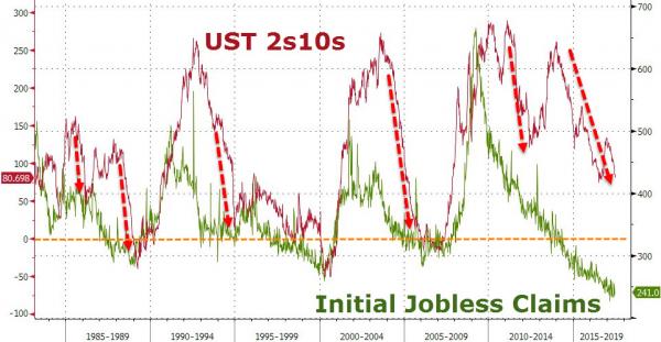 With all eyes on a collapsing yield curve and its implications - exposing the dismal reality of US economic growth expectations that The Fed would really rather you ignore - this morning's jobless claims data (at 240k, near 44 year lows) further confirms the historical pattern that suggests yield curve inversion looms. ..