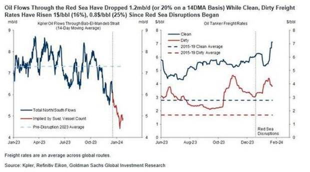 At the same time, Goldman's indices of global freight rates for clean and dirty oil tankers have risen 1$/bbl (16%) and 0.8$/bbl (25%), respectively since the disruptions began. The impact of Red Sea disruptions on volumes through the Red Sea and on freight rates is significantly larger for containers transporting goods than for oil tankers (and certainly for US and European ships than for Chinese and Russian ones).