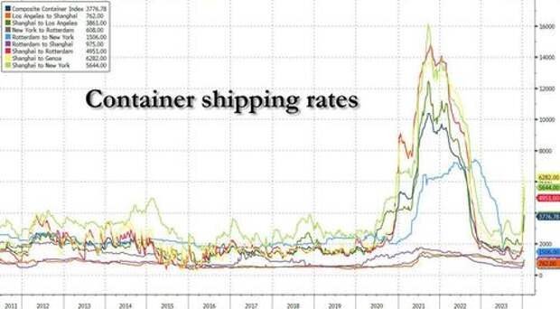 One month ago, when it first became apparent that the Red Sea blockage by Iranian proxies would prove to be a prolonged affair, we warned that "Red Sea Blockage Means A New Round Of Surging Cost-Push Inflation", which got confirmation just a few days later when we showed the sudden spike in container shipping rates that used the Suez Canal as a transit choke point.
