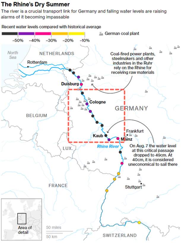1 inches) by Saturday, offering some relief to shippers. By Sunday, water levels could be as high as 49 centimeters (19.3 inches).Disruptions on the Rhine are bad news for Germany and the millions of tons of commodities and other goods shipped through inland Europe amid the worst energy crisis in decades.