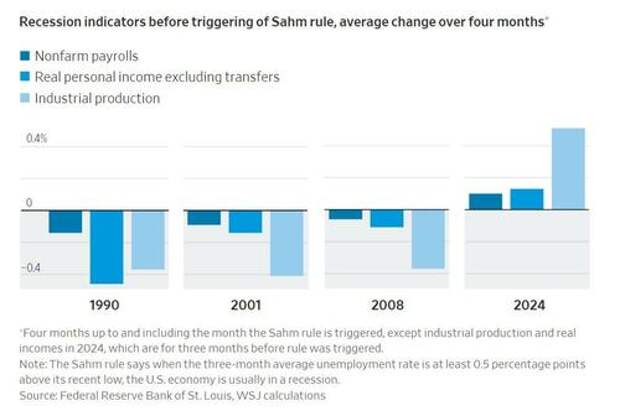 To decide if it’s raining, it’s better to stand outside than count umbrellas. Similarly, to determine whether recession has begun, better to look at the indicators the NBER uses than the Sahm rule. Three—payroll employment, industrial production and real (inflation-adjusted) incomes, minus government transfers—were all shrinking in the four months up to and including the month the Sahm rule was triggered, in 1990, 2001 and 2008. In all three, a recession had begun several months earlier.