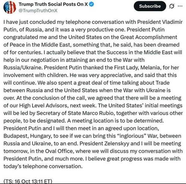 President Trump has just concluded his "lengthy" phone conversation with Russian President Vladimir Putin, after which he declared on Truth Social that "great progress was made" towards peace in the Ukraine conflict.