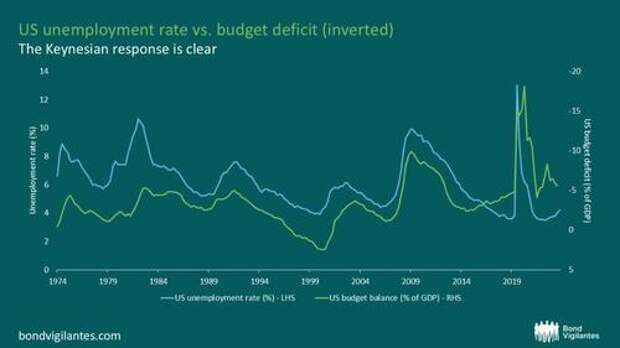 The chart below shows the unemployment rate vs. the deficit (inverted):