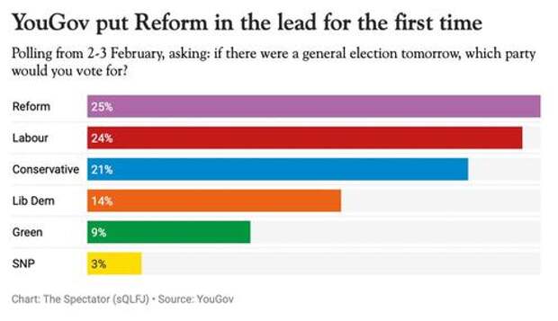There’s reason for cheer at Reform HQ this morning: Nigel Farage’s party is leading Labour in a YouGov voting intention poll for the first time. According to the poll, Reform UK leads on 25 points with Labour in second place on 24 per cent and the Conservatives in third on 21 per cent. Meanwhile, the Liberal Democrats are on 14 per cent and the Greens on 9 per cent. While there have been a handful of polls to date putting Reform in the lead, they have so far been regarded as outliers. In response to the poll, Richard Tice, the deputy leader of Reform, said: ‘Much more to come as common sense policies welcomed to save Britain and make us better off’. -Spectator.co.uk
