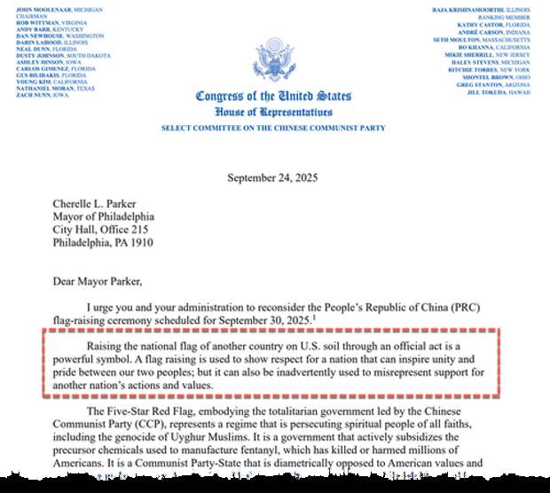 "In a letter to Mayor Cherelle Parker, Rep. John Moolenaar of Michigan warned the city not to allow itself "to be exploited as a tool for CCP propaganda," arguing that raising the Five-Star Red Flag "sends the wrong message" in the birthplace of American independence. He cited Beijing's persecution of minorities, the genocide of Uyghur Muslims, and subsidization of fentanyl precursor chemicals as reasons the ceremony should be scrapped.
