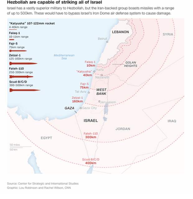 Hezbollah is heavily armed with missiles and drones. CNN provides a threat map of the militia's missile ranges.