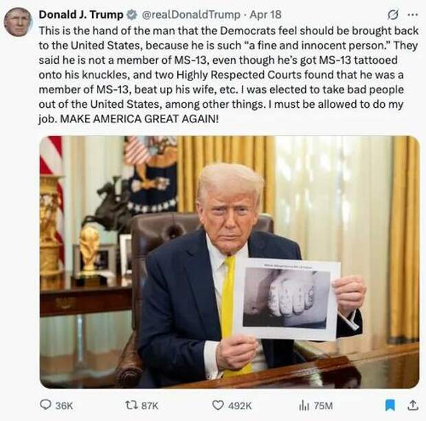 Meanwhile, the Abrego Garcia case has become especially politicized in the last week. Democratic Senator Chris Van Hollen of Maryland and four members of the House of Representatives have flown to El Salvador in the hopes of facilitating Abrego Garcia’s return, and the Department of Homeland Security posted on X documents that show Abrego Garcia’s wife sought a domestic violence protective order against him in 2021. Trump also posted this: