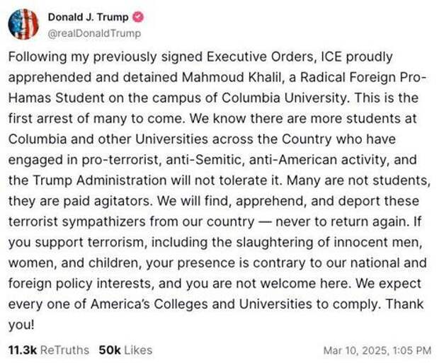 Two days later, Trump called Khalil “a Radical Foreign Pro-Hamas Student” and indicated that his apprehension would be “the first arrest of many to come.”
