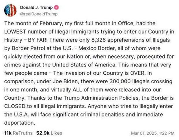 The result: the number of southern border apprehensions in March — 7,181 — was the lowest since monthly data started being collected in 2000, according to Reuters. The previous low? About 8,300 in February 2025. That prompted Trump to declare “The Invasion of our Country is OVER”: