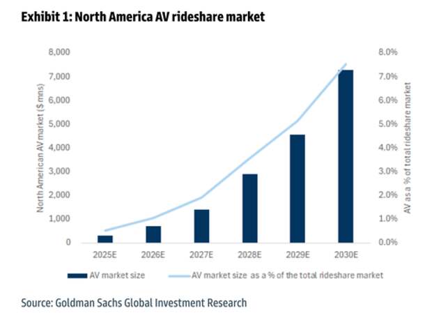 The U.S. rideshare market, currently valued at $58 billion, is expected to swell to over $336 billion by 2030. Delaney estimates robotaxis will capture about $7 billion of that market, representing 8% of total rideshare bookings. While this figure may seem modest, it represents a significant leap from the $300 million projected for 2025, with a nearly 90% compound annual growth rate.