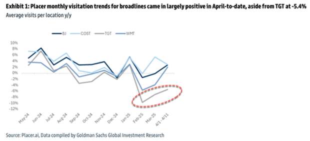 HundredX and Placer data indicate TGT's sales may be slowing. We analyzed monthly visitation data using Placer for the broadlines category, including TGT, through mid April. As shown in Exhibit 1, while average visits per location (y/y) were largely positive in Apr' 25-to-date, TGT came in at -5.4%. TGT's trends have lagged behind select peers (BJ, COST, and WMT) since Aug '24, with the gap widening sequentially in Apr' 25-to-date: Goldman