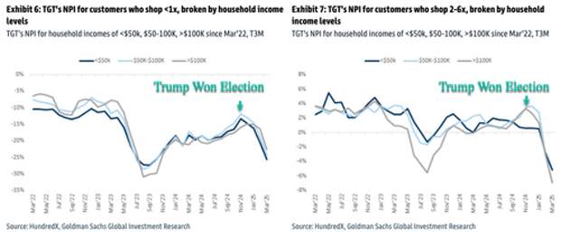 Target's NPI across three household income levels ($100K) aggressively tumbled, beginning with the election of Trump and into 2025.
