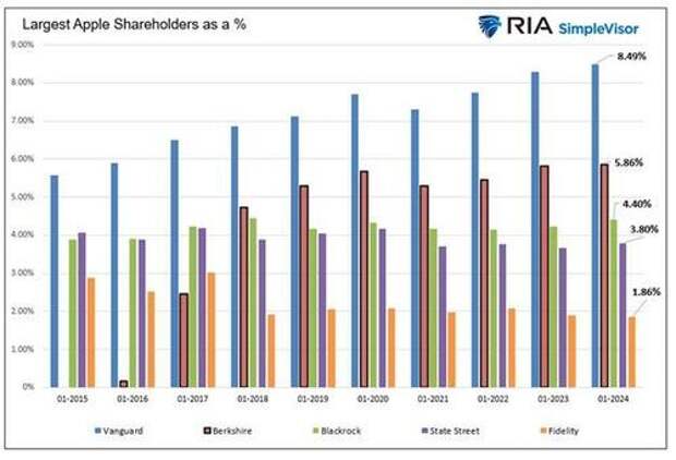 The bar graph below compares Berkshire’s percentage ownership of Apple to that of the four largest mutual fund and ETF complexes. Berkshire had no position in Apple in 2015 and now holds over 5% of the company. Only Vanguard has a more significant position.