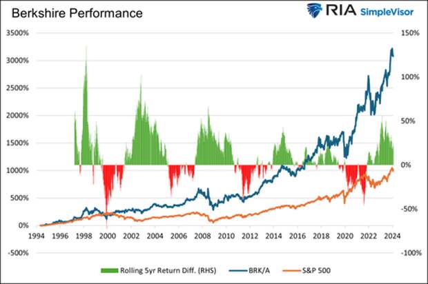 The graph shows that over the last 30 years, Berkshire’s price return has tripled that of the S&P 500.