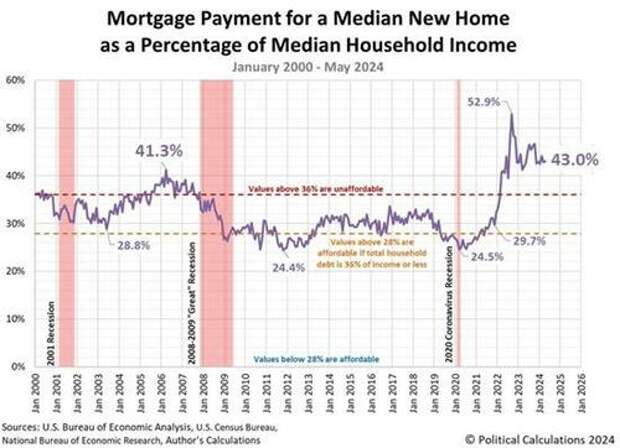 As we all know, both the purchase price and the interest rate have gone up significantly, pushing the mortgage payment as a percentage of median household income up to levels that exceed the previous peak in Housing Bubble #1 circa 2006-08.