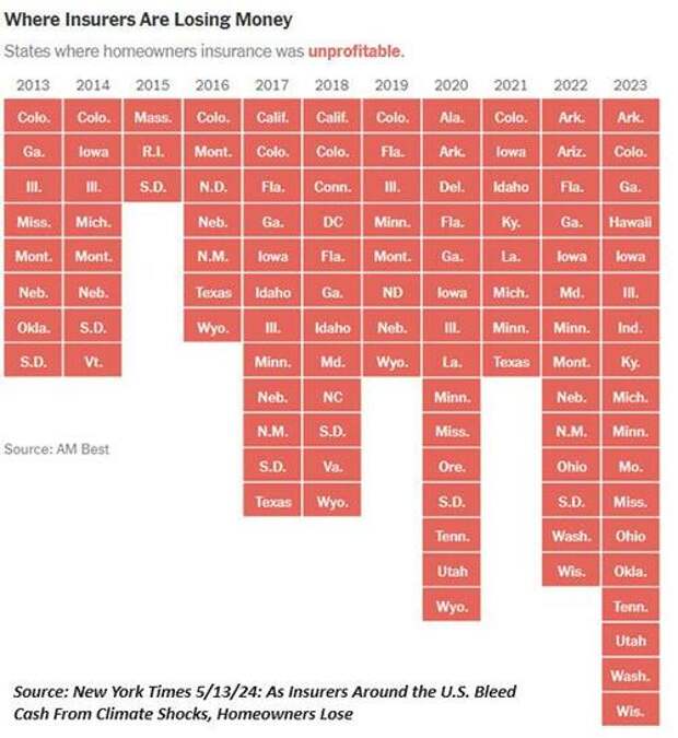 Anecdotally, we're hearing accounts of basic home insurance jumping from $3,000 to $13,000 annually in high-risk regions. We're also hearing of insurers abandoning high-risk areas and entire states, leaving homeowners with few options for insurance. In response, some homeowners are "self-insuring," i.e. they have dropped insurance coverage.