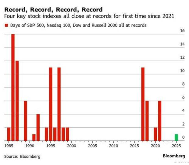 Thursday’s price action saw the S&P 500 Index, the Nasdaq 100, the Dow Jones Industrial Average and the Russell 2000 all close at all-time highs - a rare occurrence seen on just 25 other days this century, data compiled by Bloomberg show.