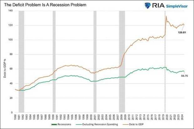 Similarly, before the pandemic, it had been relatively flat for seven years. This highlights that the deficit problem we have today was exacerbated by recession-prompted fiscal stimulus and the temporary decline in GDP.To illustrate this more clearly, we created the green line.